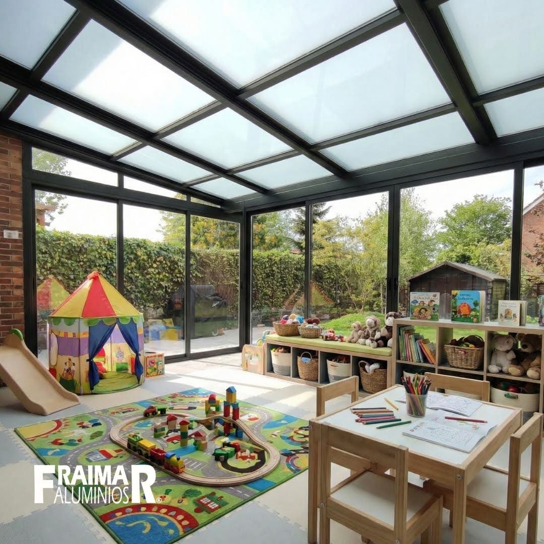 Si tienes niños pequeños, transformar la terraza cerrada en una zona de juegos segura es una excelente opción. Con el cerramiento adecuado, puedes crear un espacio protegido donde los niños puedan jugar libremente, sin las preocupaciones del clima exterior.